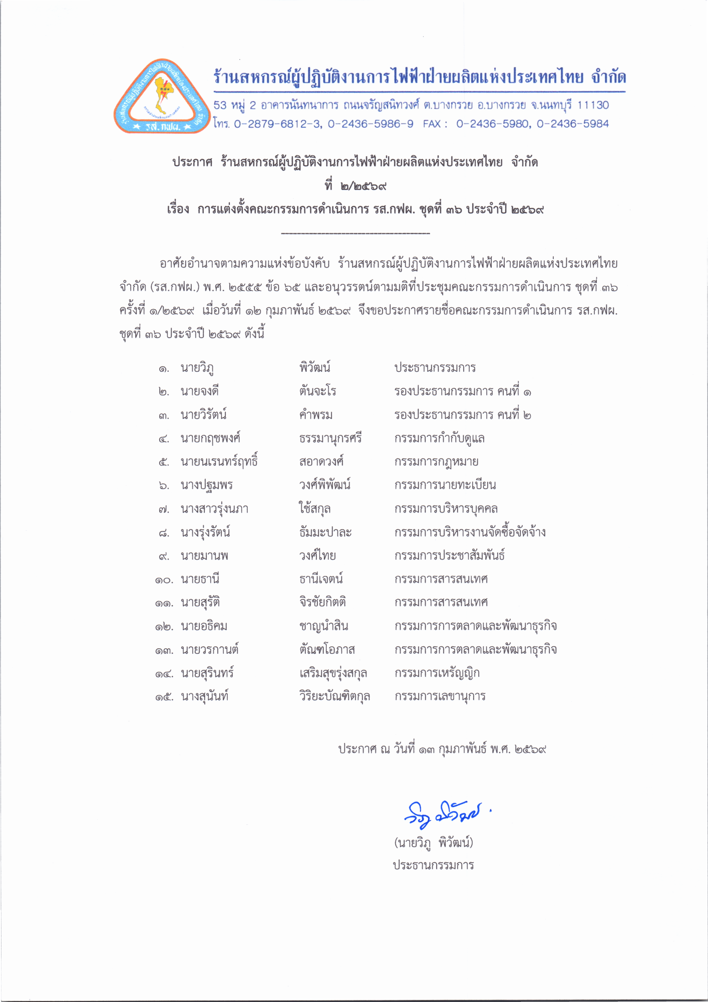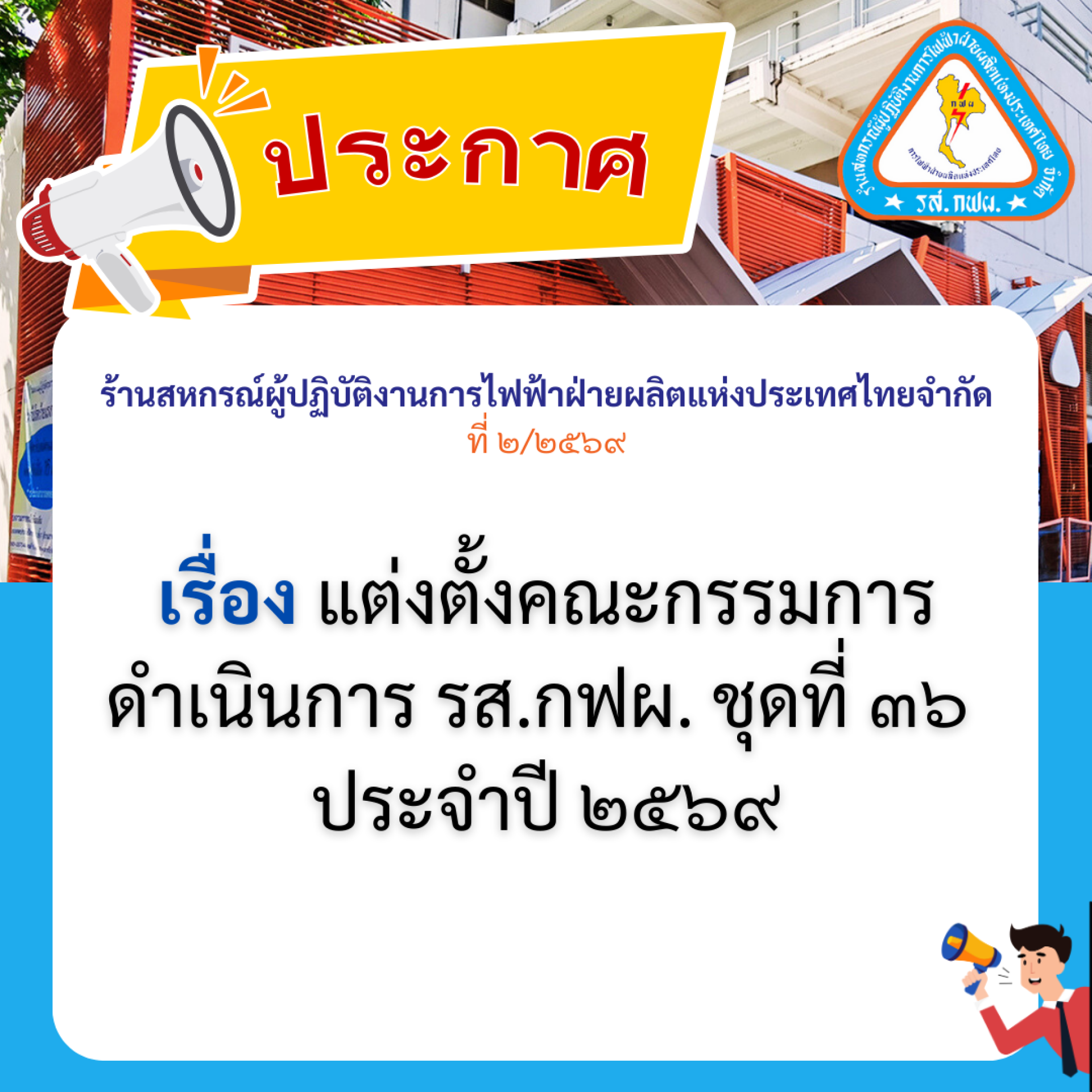 เรื่อง แต่งตั้งคณะกรรมการดำเนินการ รส.กฟผ. ชุดที่ ๓๖ ประจำปี ๒๕๖๙