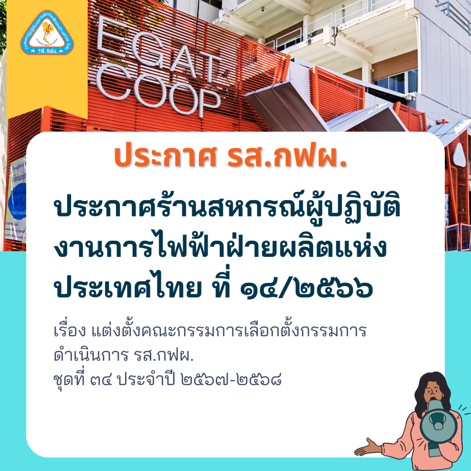 ประกาศ ร้านสหกรณ์ผู้ปฏิบัติงานการไฟฟ้าฝ่ายผลิตแห่งประเทศไทย จำกัด ที่ ๑๔/๒๕๖๖