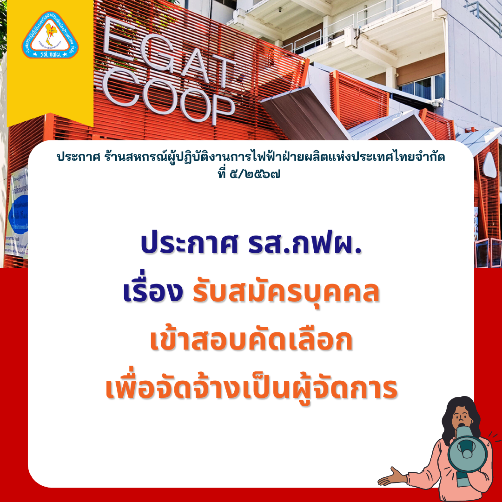 ประกาศ ร้านสหกรณ์ผู้ปฏิบัติงานการไฟฟ้าฝ่ายผลิตแห่งประเทศไทย จำกัด ที่ ๕/๒๕๖๗