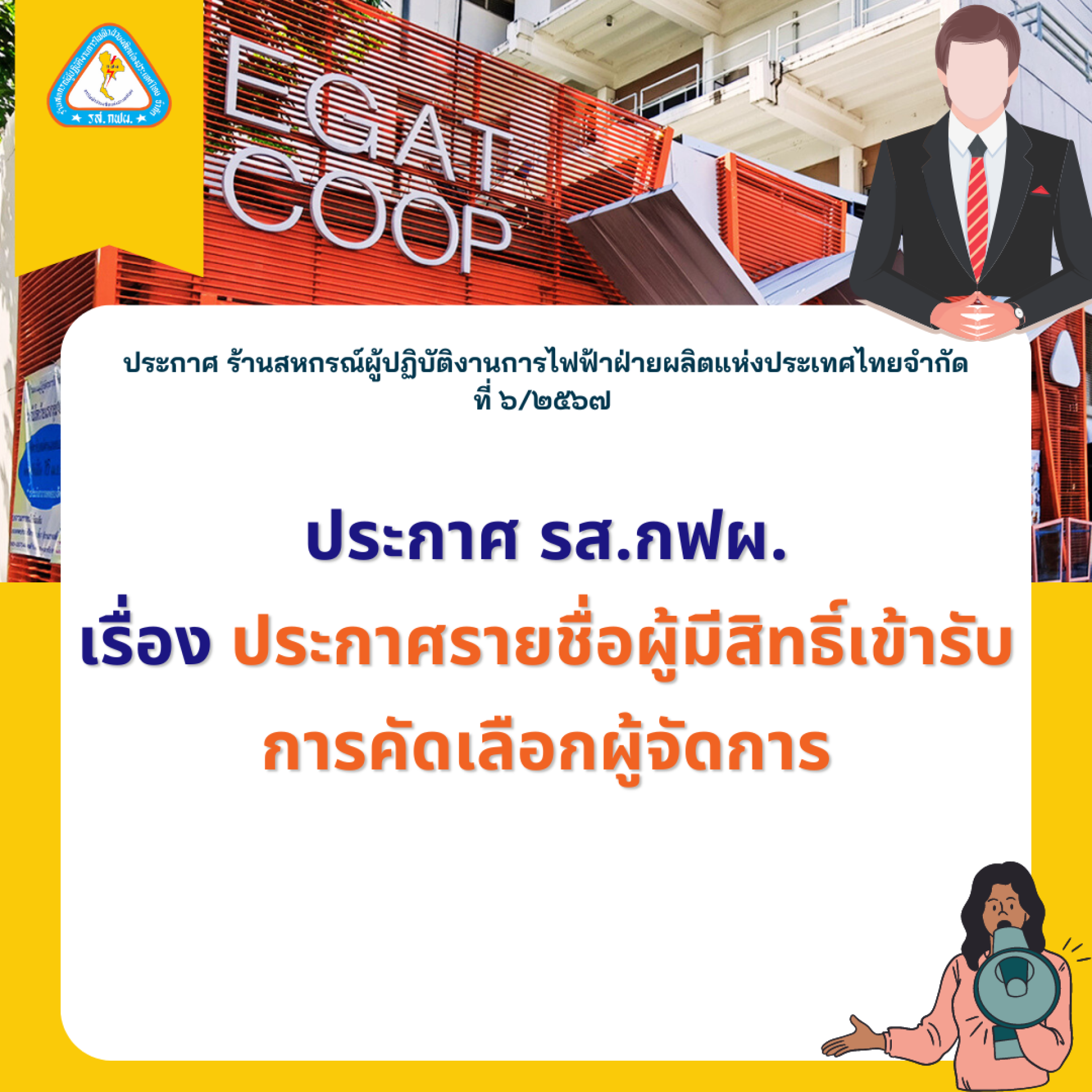 ประกาศ ร้านสหกรณ์ผู้ปฏิบัติงานการไฟฟ้าฝ่ายผลิตแห่งประเทศไทย จำกัด ที่ ๖/๒๕๖๗