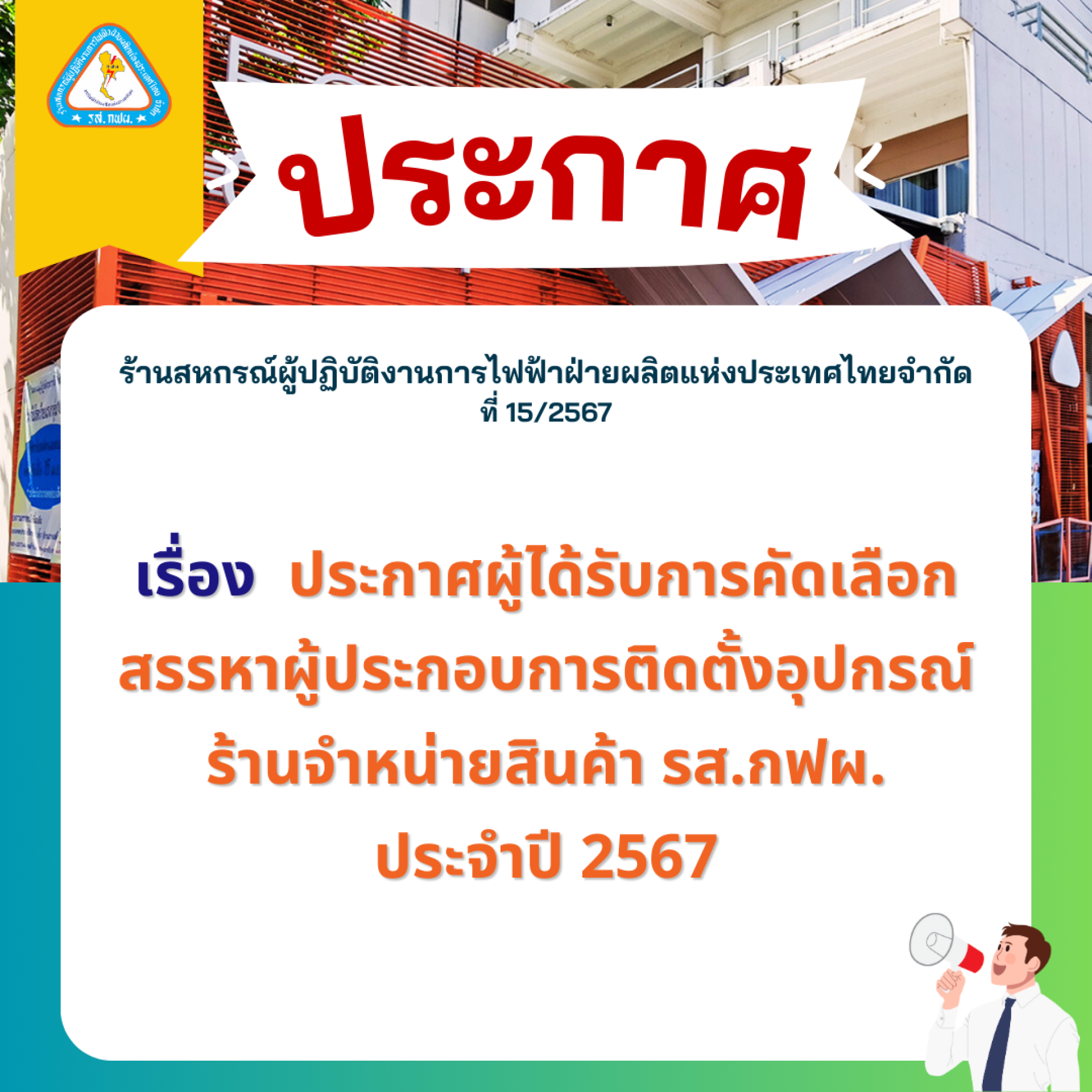 เรื่อง ประกาศผู้ได้รับการคัดเลือก สรรหาผู้ประกอบการติดตั้งอุปกรณ์ ร้านจำหน่ายสินค้า รส.กฟผ. ประจำปี 2567