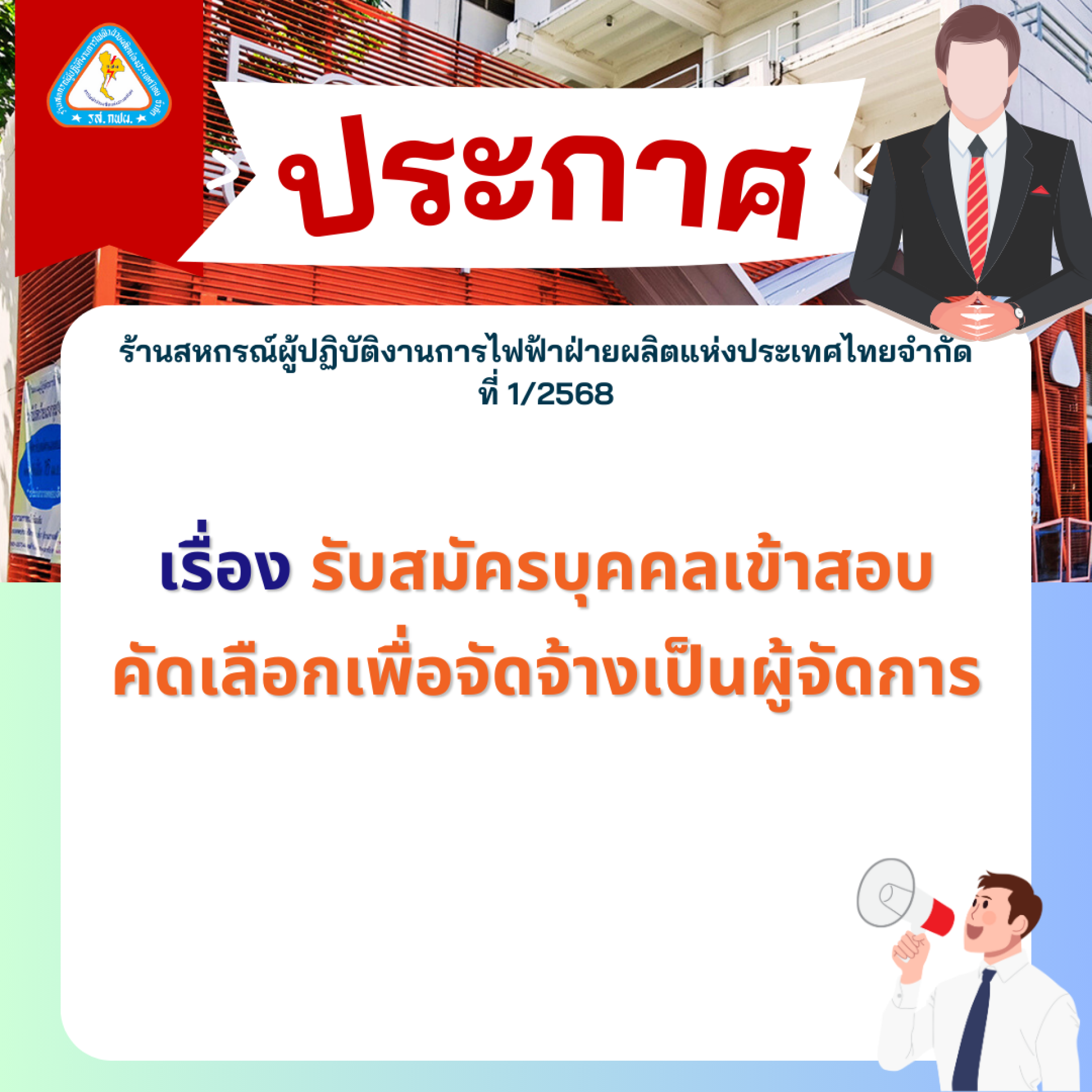 ประกาศ ร้านสหกรณ์ผู้ปฏิบัติงานการไฟฟ้าฝ่ายผลิตแห่งประเทศไทย จำกัด ที่ 1/2568