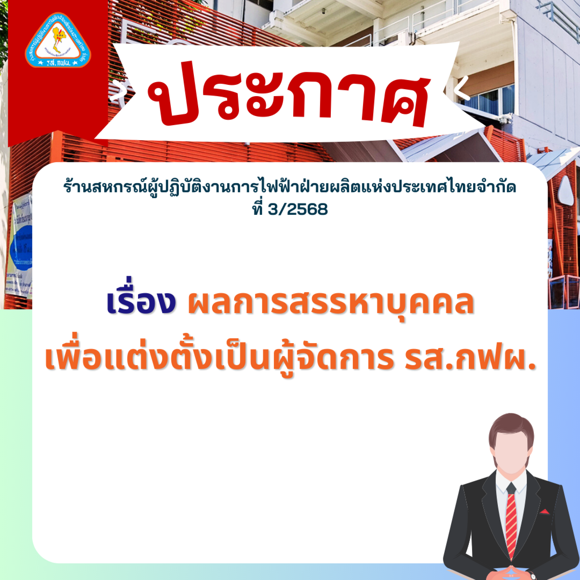 ประกาศ ร้านสหกรณ์ผู้ปฏิบัติงานการไฟฟ้าฝ่ายผลิตแห่งประเทศไทยจำกัด ที่ 3/2568